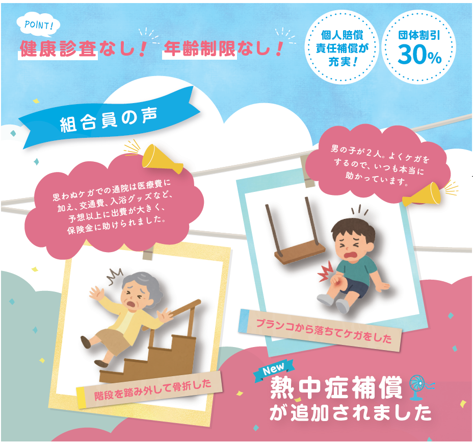 ケガによる入院・通院、賠償責任をサポートする、全ての年齢の方がご加入いただける保険です。